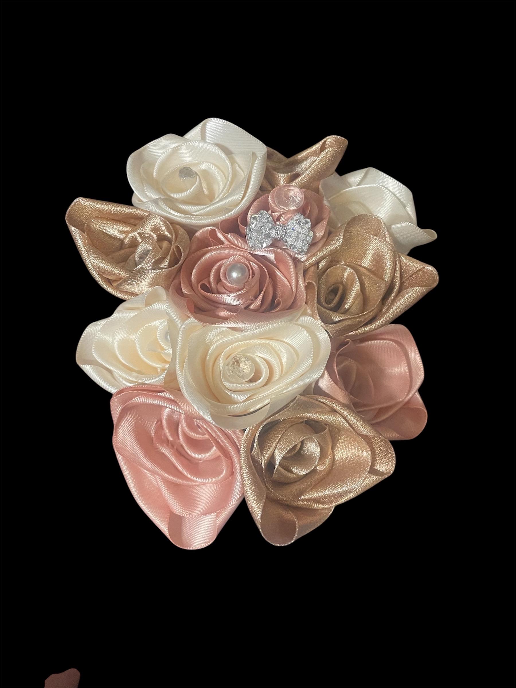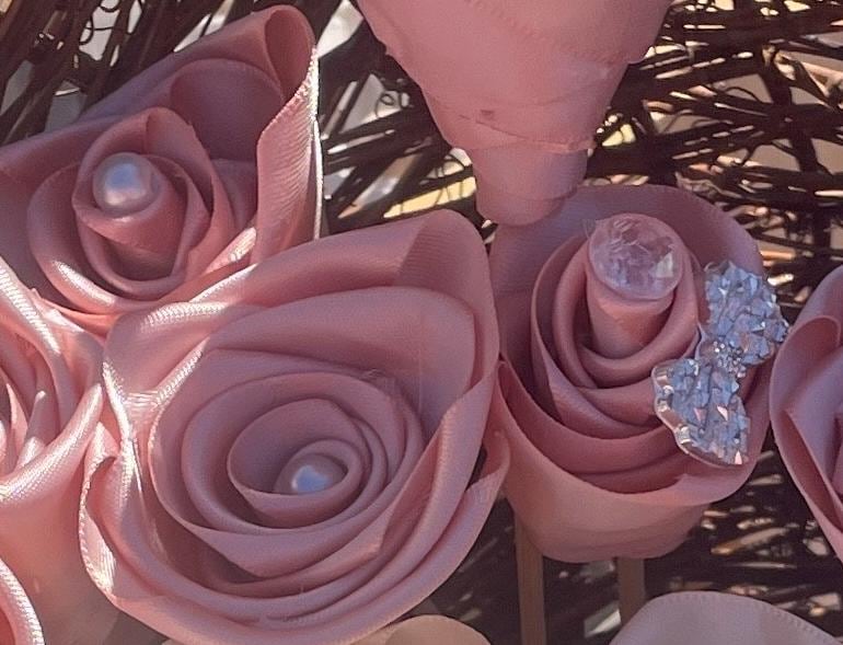 The satin ribbon and gem roses are intricately handcrafted by Akasha, offering a luxurious design that combines elegance with meticulous attention to detail. Each rose features soft satin petals paired with sparkling gem center embellishments, creating a timeless and sophisticated look. These versatile decorative pieces are perfect for enhancing gift wrapping, wedding decor, craft projects, or any special occasion that requires a touch of refinement. With their handmade quality and elegant craftsmanship, these roses make a beautiful addition to your creative endeavors, ensuring a polished and professional finish.