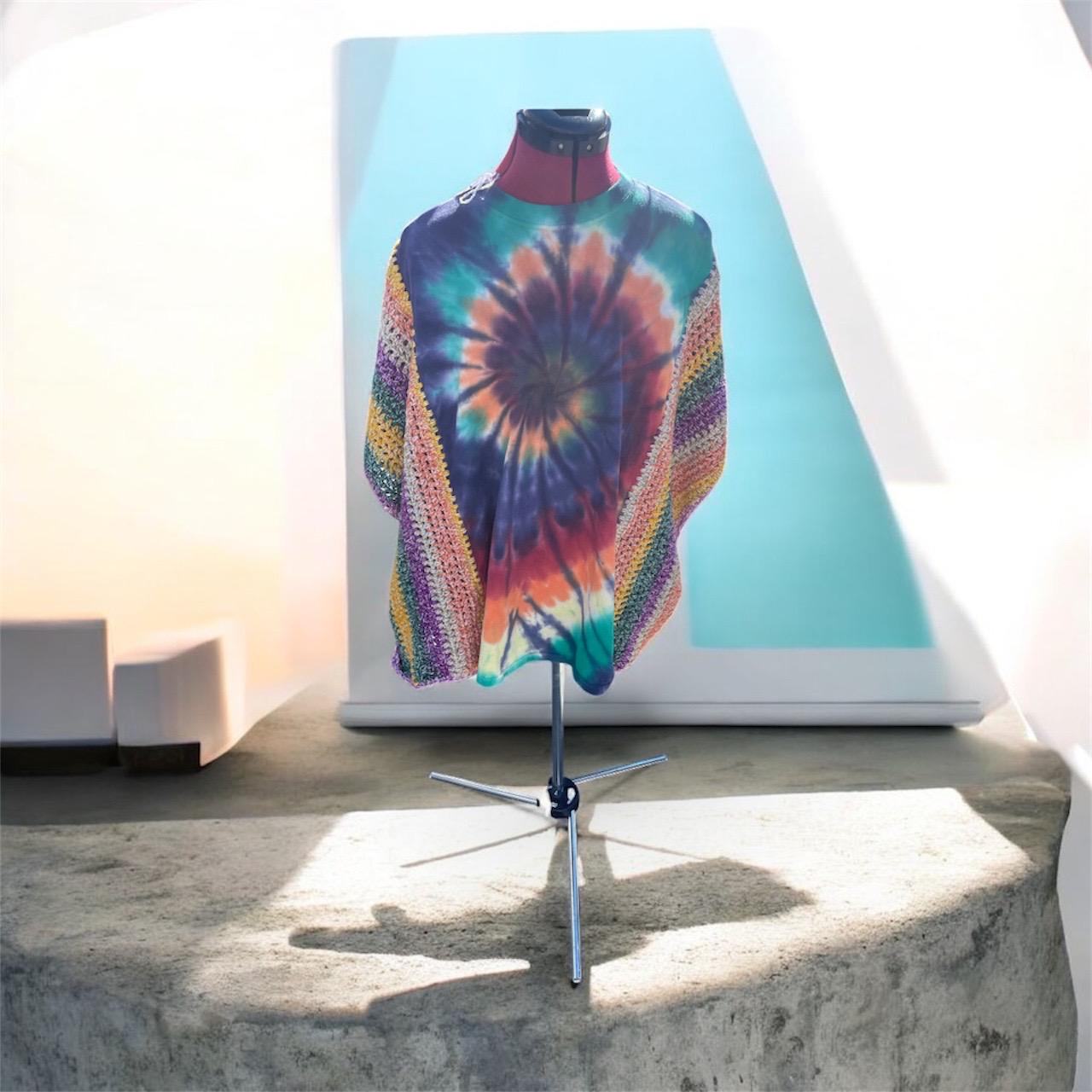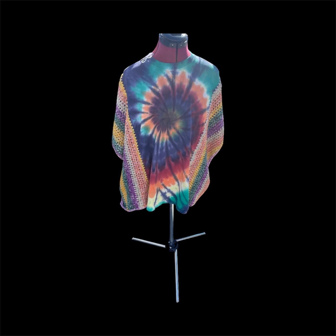 Discover the unique blend of sustainability and craftsmanship with our handmade ponchos, upcycled from soft, pre-loved T-shirts. Each poncho features carefully crocheted sides, adding durability and a touch of intricate design to the modern aesthetic. This eco-friendly approach not only reduces waste but also ensures each piece is one-of-a-kind, with variations in color and pattern. Lightweight and breathable, these ponchos are ideal for layering throughout the year, offering both comfort and style. Perfect for those who value sustainable fashion without compromising on quality or individuality.
